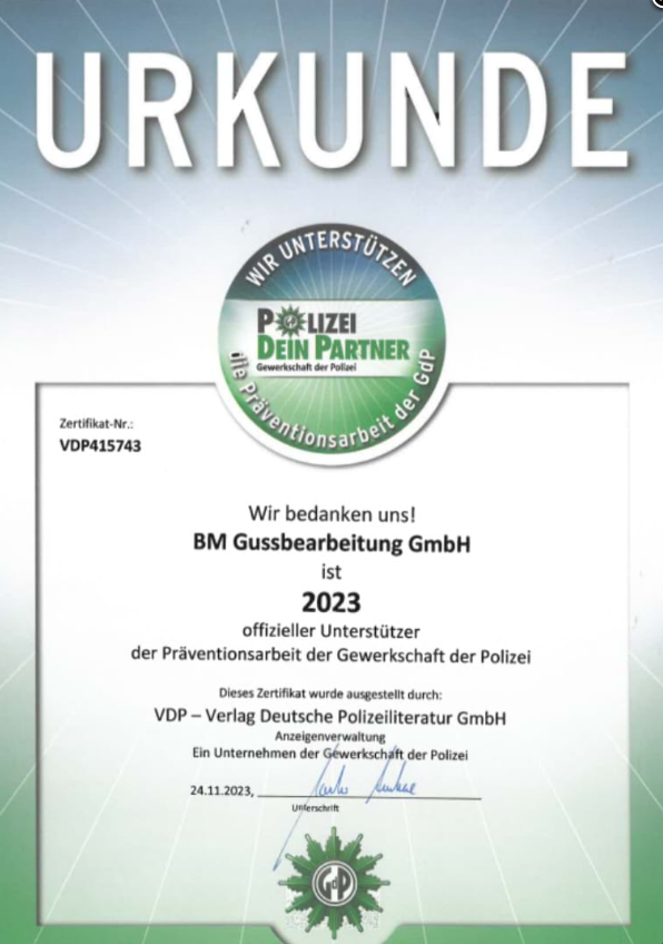 Die BM Gussbearbeitung GmbH ist 2023 offizieller Unterstützer der Prävantionsarbeit der Gewerkschaft der Polizei.