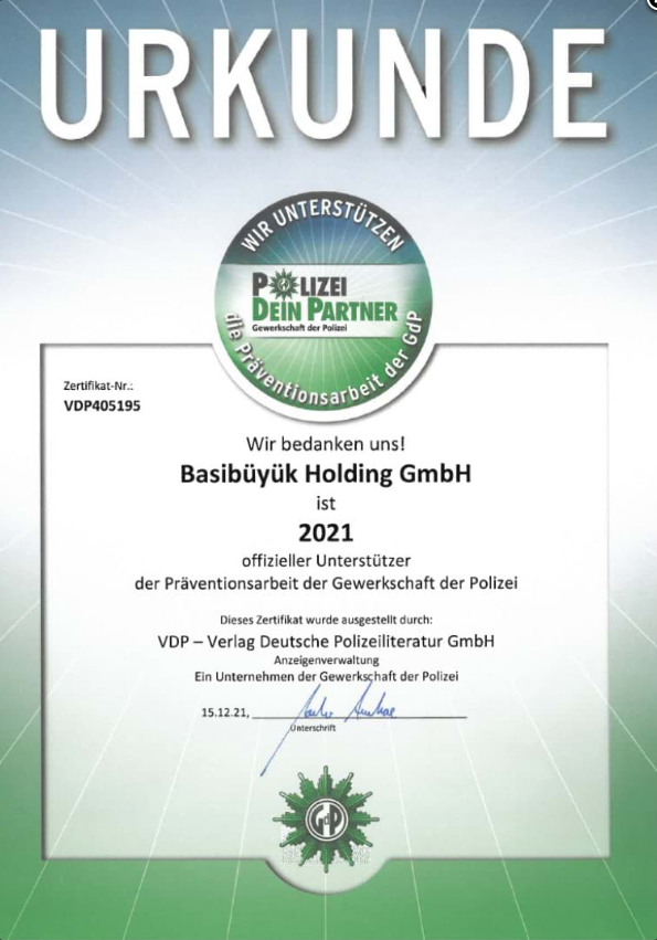 Die Basibüyük Holding GmbH ist 2021 offizieller Unterstützer der Prävantionsarbeit der Gewerkschaft der Polizei.